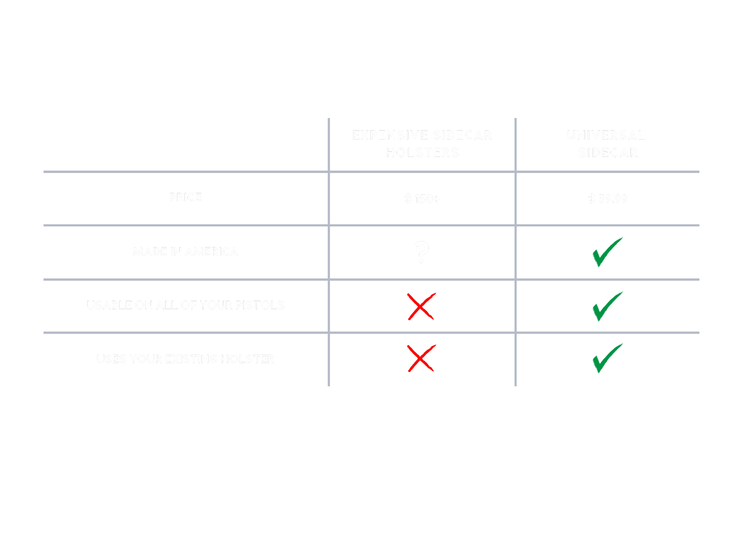 Sidecar Holsters, ReinventedProudly engineered and manufactured in Jonesborough, TN Quick View Universal Sidecar SHOP NOW WE ALSO DIDN’T WANT TO PAY $150 TO CARRY A SPARE MAGAZINE. So, we did something about it. Subscribe Sign up with your email address to receive news and updates. Email Address Sign Up We respect your privacy. Thank you!